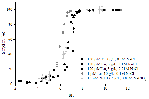 Sorption edges of Eu, La, Lu, Nd, and Y on K-feldspar are plotted in Fig. 1. Constant, low sorption is detected for pH<5. The amount of sorption in this pH range depends on ionic strength, indicating outer sphere sorption. A steep increase in sorption was observed between pH 6 and 7, leading to complete sorption at pH ≥ 7.5. At higher pH, sorption remains constant at ~100 %. For high metal concentrations (100 µM), surface precipitation cannot be excluded at high pH.